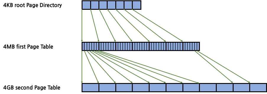 - 이를 해결하기 위한 대표적인 방법이 계층 구조 page table이다. 주로 2단계 계층 구조, 3단계 계층 구조 등이 있다. 우선 page directory가 있어 각각의 항목이 page table을 가리키도록 한다. page directory가 가리키는 page table이 꽉 찼을 경우에만 page directory의 다음 항목에서 새로운 page table을 가리키도록 동적으로 운용하는 방식이다. 아래는 2단계 계층구조 페이지 테이블
