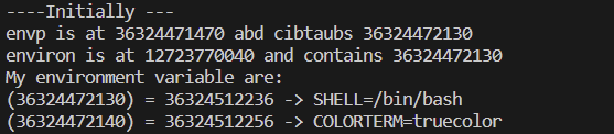 printf("environ is at %8o and contains %8o\n",&environ,environ);