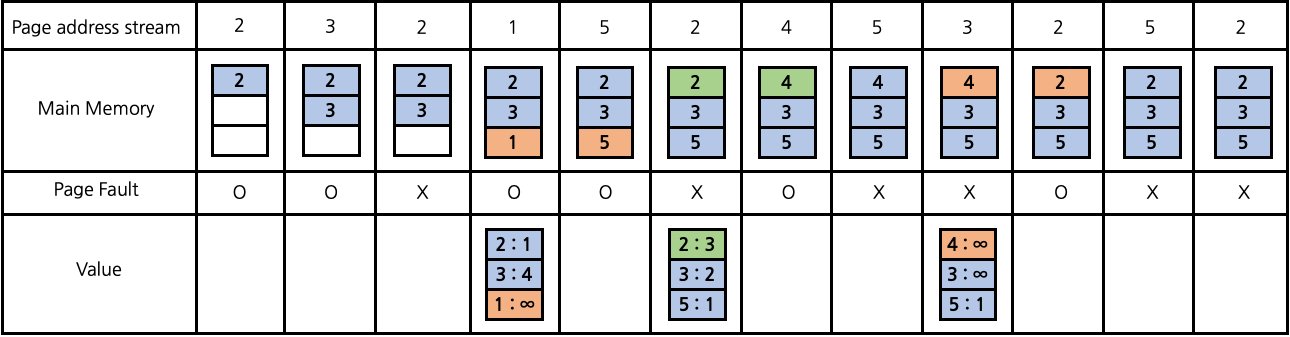 - PAGE FRAME이 미래에 얼마나 참조될지 예측하는것.