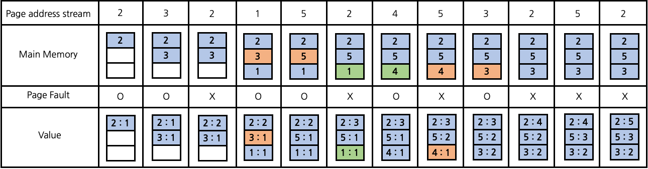 - 참조된 빈도가 낮은 PAGE를 교체하는 것이다.